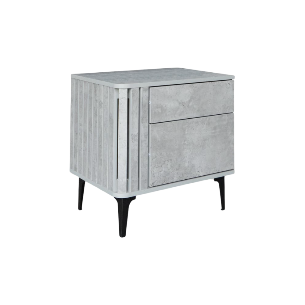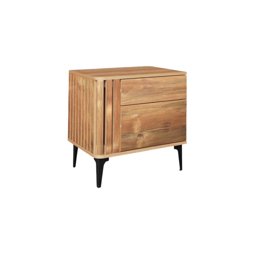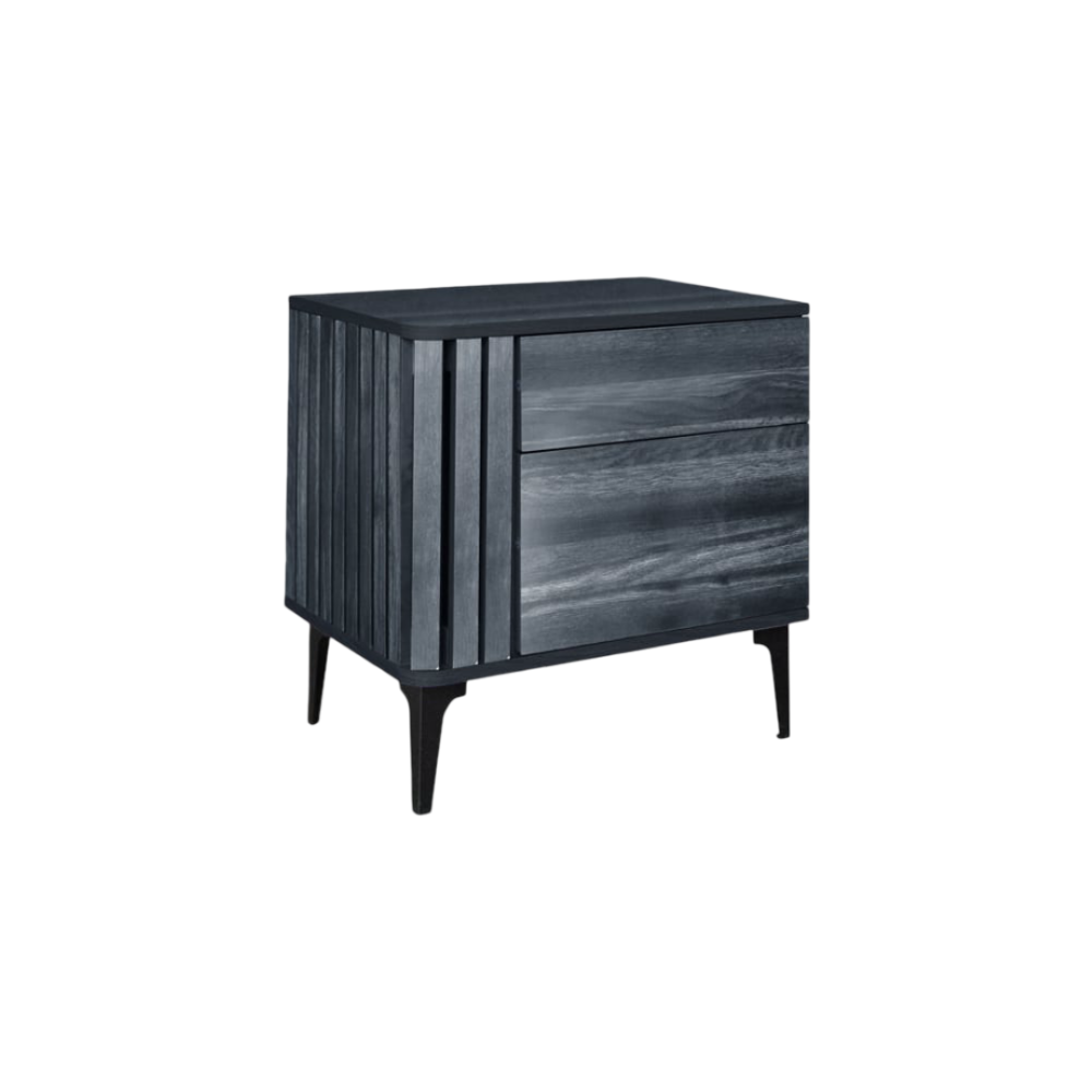 يتميز الكمودينو بدرجين واسعين يوفران مساحة تخزين كافية ومنظمة، بالإضافة إلى جزء جانبي بتصميم شرائح عمودية تضيف عمقًا بصريًا وجمالية فريدة للقطعة. هذا التصميم المبتكر يجعل الكمودينو ليس مجرد قطعة أثاث، بل تحفة فنية بحد ذاتها.
