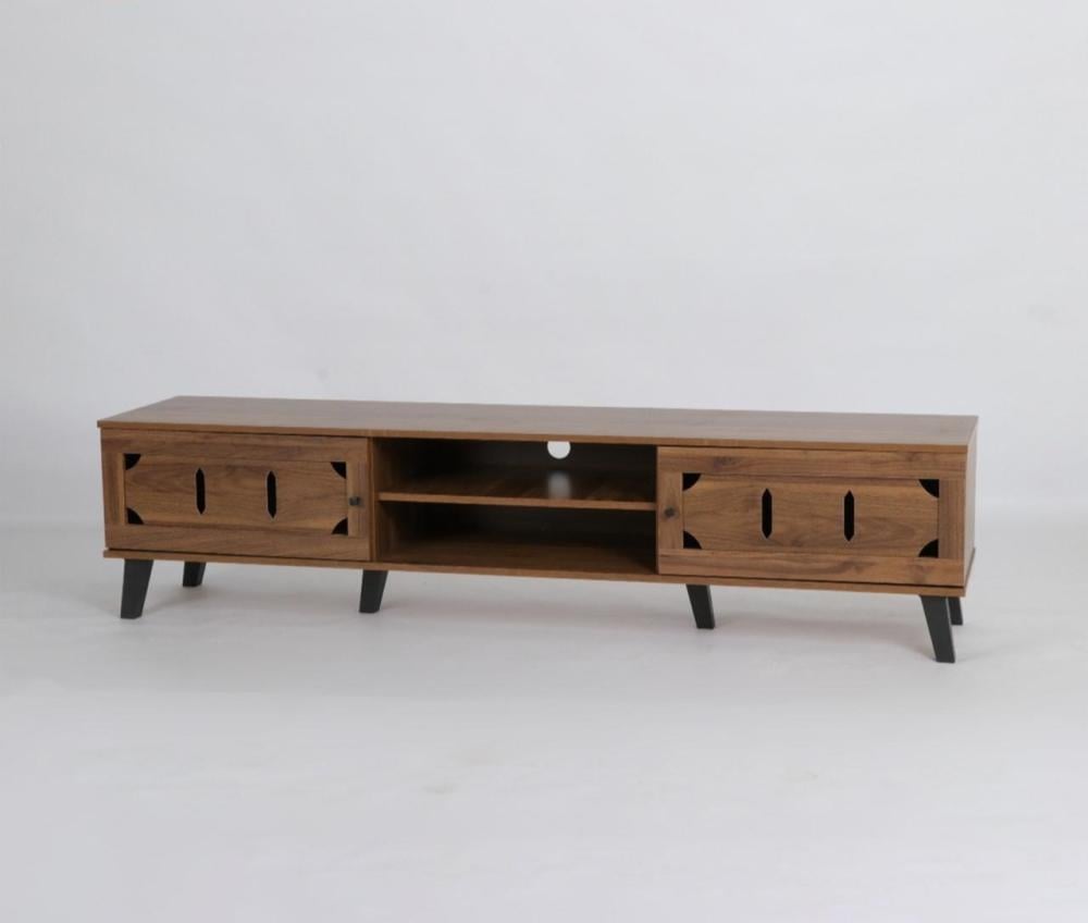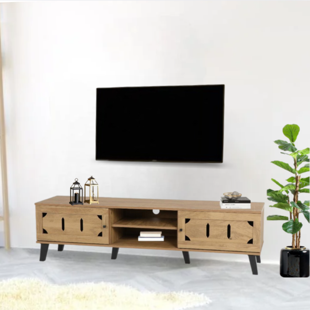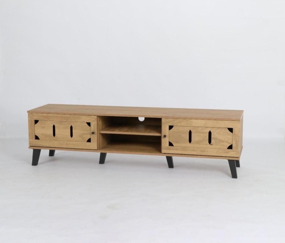 طاولة تلفاز عصرية وأنيقة، بتصميم فريد يبرز جمال اللون الخشبي البني الفاتح الدافئ. بطول 160 سم، توفر هذه الطاولة حلاً مثاليًا لمركز الترفيه في منزلك، حيث تجمع بين الجمالية الجذابة والتخزين العملي. تصميم الأبواب المزينة بنقوش هندسية بسيطة يضفي عليها طابعًا مميزًا، مما يجعلها قطعة أثاث تزيد من أناقة أي غرفة معيشة أو جلوس