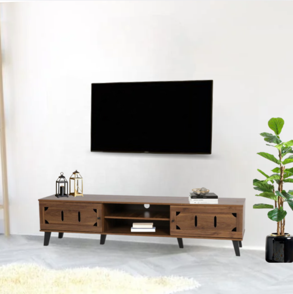 - رفوف مفتوحة مركزية: توفر مساحتين مفتوحتين في المنتصف، مثالية لوضع أجهزة الاستقبال، مشغلات الوسائط، أجهزة الألعاب، أو حتى قطع الديكور، مع فتحة مخصصة لإدارة الكابلات.