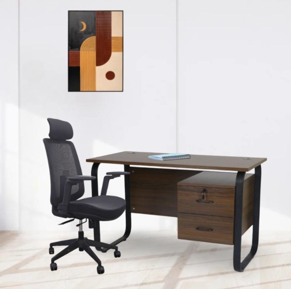 التصميم: يتميز المكتب بتصميم عصري وأنيق يجمع بين الخشب والإطار المعدني الأسود، مما يضفي لمسة من الأناقة على أي مكتب أو غرفة عمل.