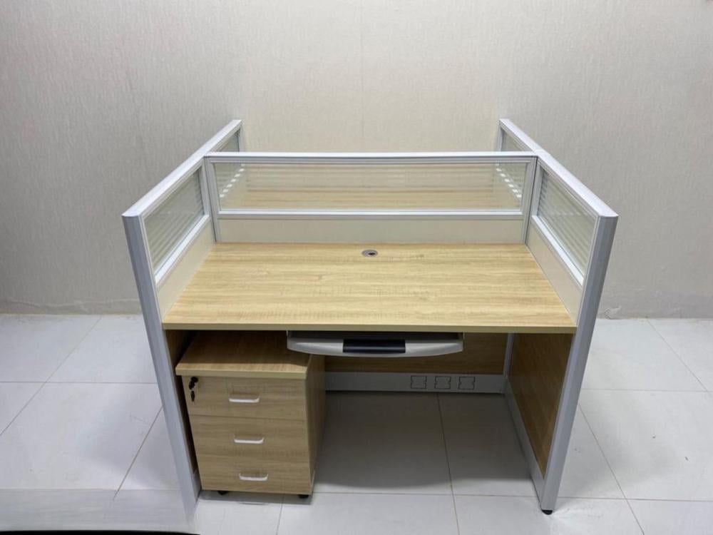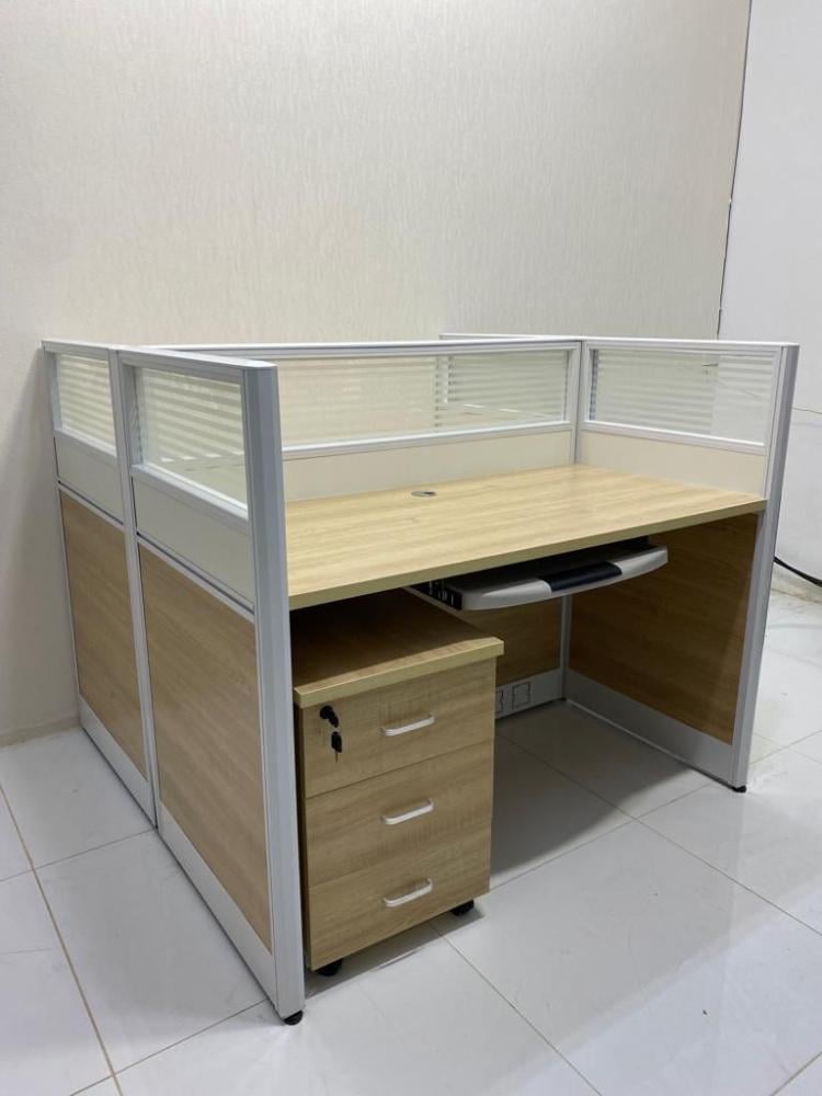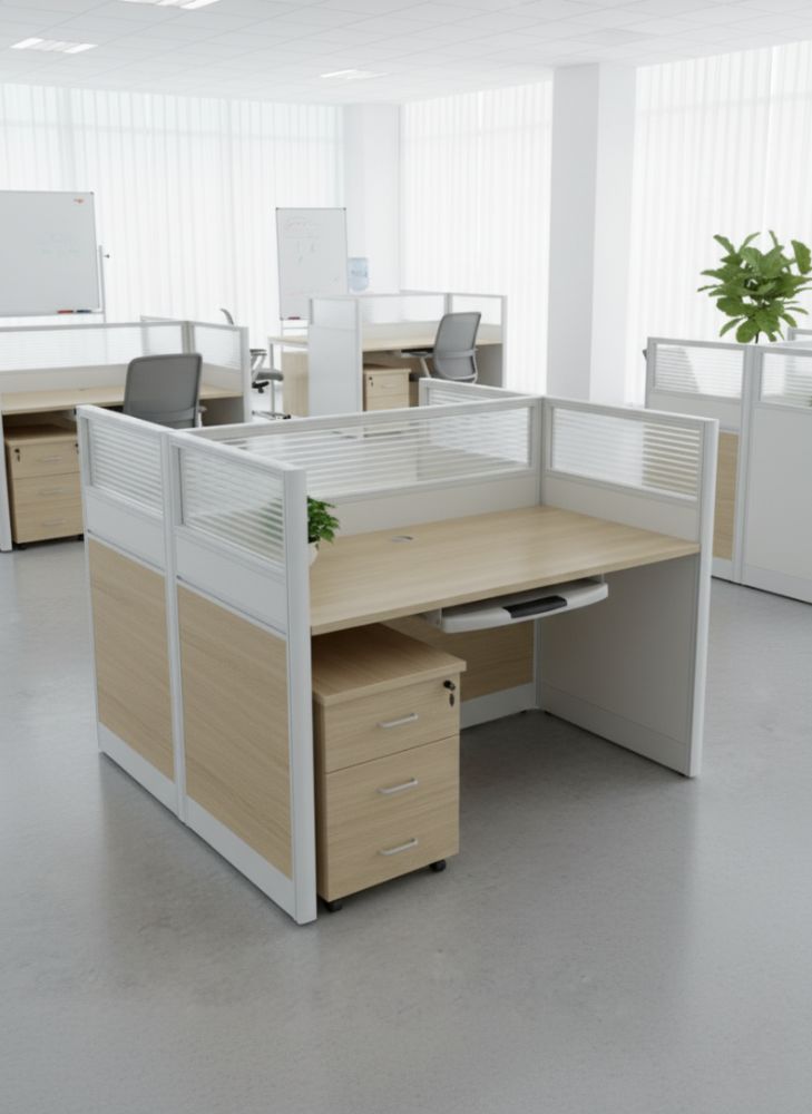 مكتب ثنائي بتصميم عصري وعملي، مناسب لبيئات العمل الحديثة التي تتطلب الاستفادة المثلى من المساحات. يتميز بهيكل متين مصنوع من الألمنيوم والخشب عالي الجودة، مع واجهات زجاجية تعزز الشعور بالخصوصية دون عزل الموظفين تمامًا.