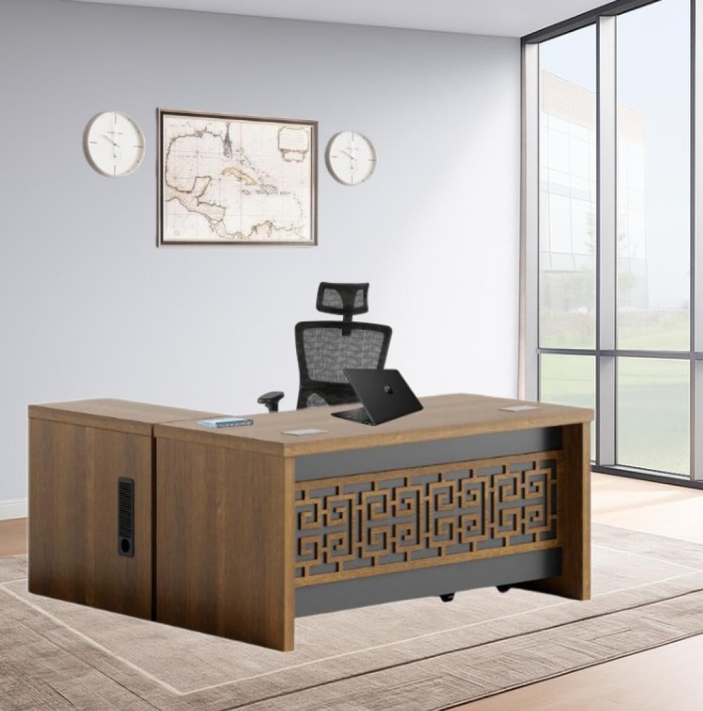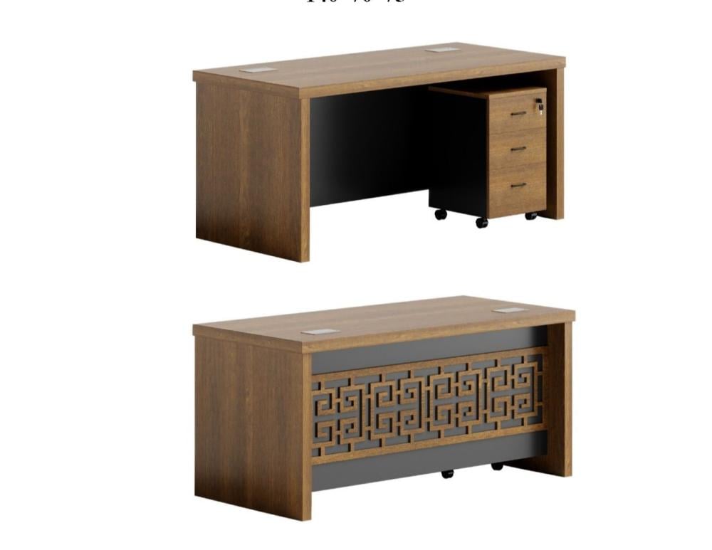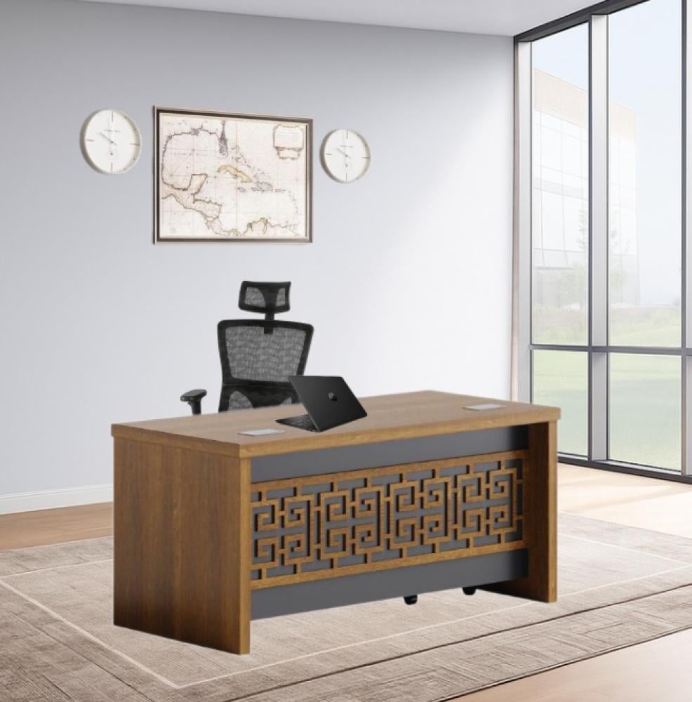تُعد طاولة المكتب تجسيدًا للأناقة والفخامة، مصممة خصيصًا لتوفير بيئة عمل مريحة وملهمة. يتميز المكتب بتصميم خشبي فريد بلون بني (BROWN) دافئ، مع واجهة أمامية مزخرفة بنقوش هندسية أنيقة باللون الرمادي الداكن، مما يضفي عليه طابعًا عصريًا وفاخرًا في آن واحد. يجمع المكتب بين سطح عمل واسع، ووحدة تخزين جانبية مدمجة قابلة للحركة لتنظيم فعال. متوفر بثلاثه مقاسات عصريك تناسب احتياجك