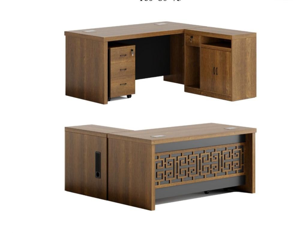 • تصميم خشبي فاخر: يتميز المكتب بتصميم خشبي أنيق بلون بني دافئ، يضفي لمسة من الفخامة والرقي على أي مساحة عمل.